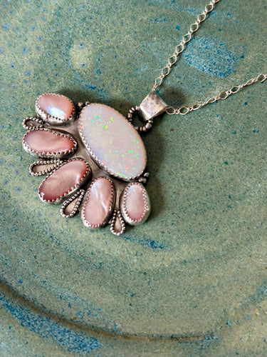 White Australian Opal and Pink Mussel Shell Floral Sterling Silver Pendant Necklace