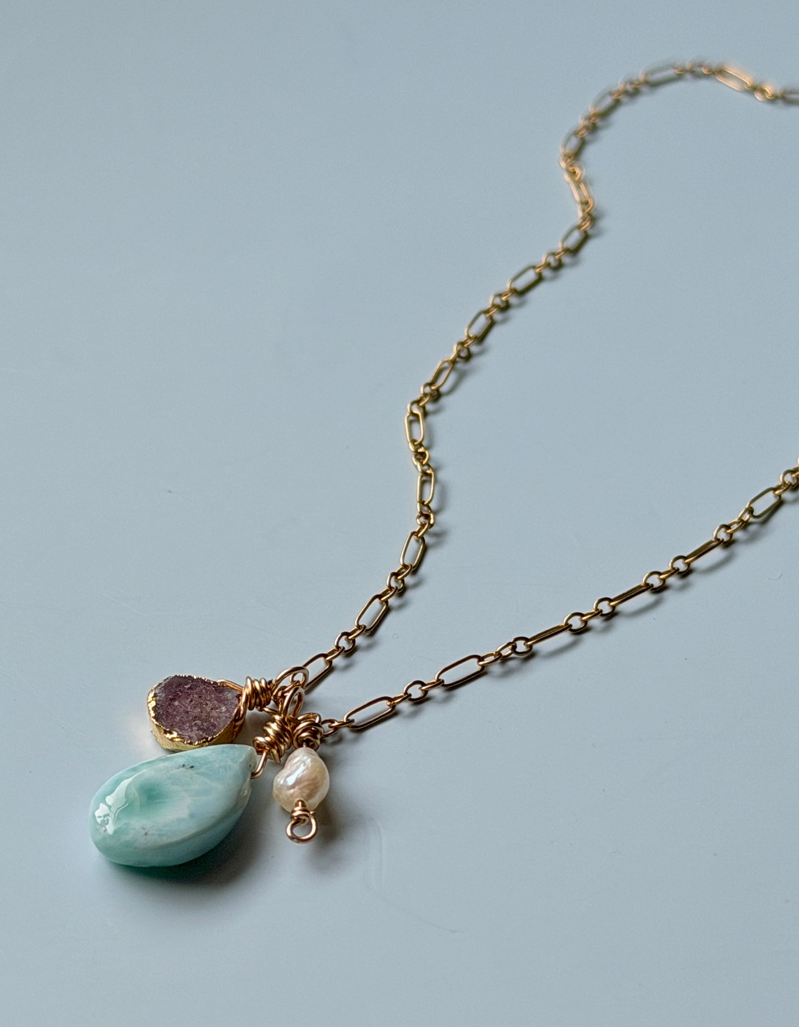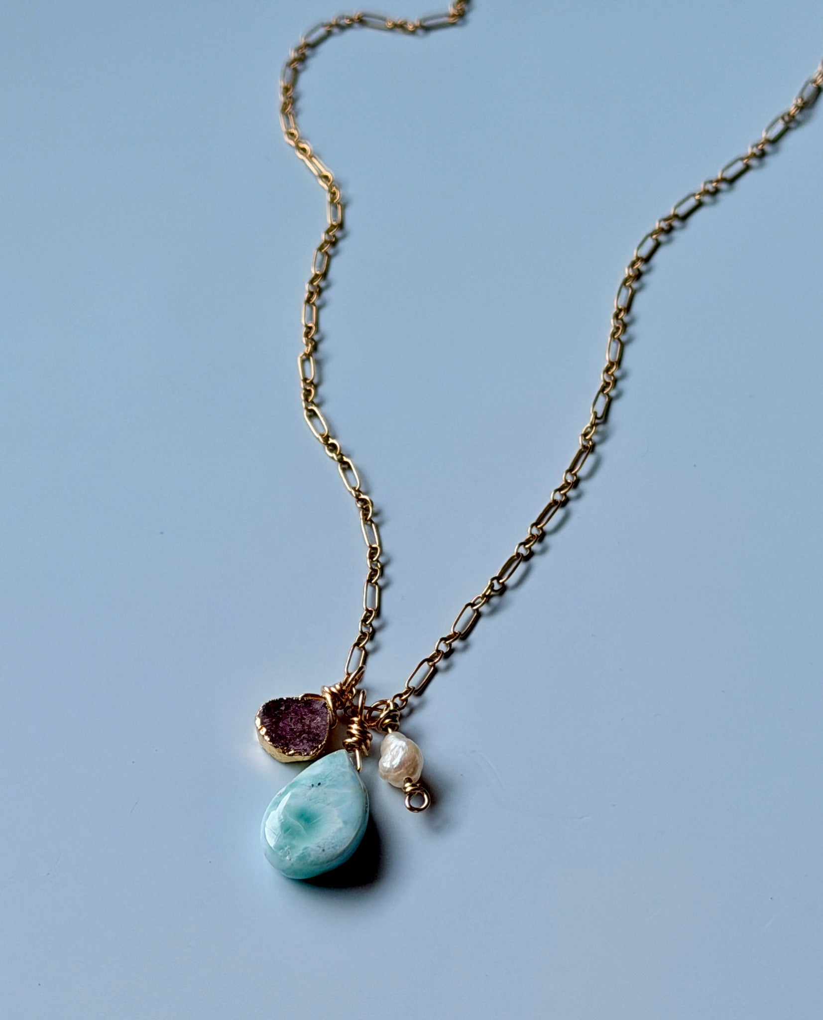 A nautical combo of freshwater pearl and larimar, paired with an golden electroplated ruby gemstone drop.