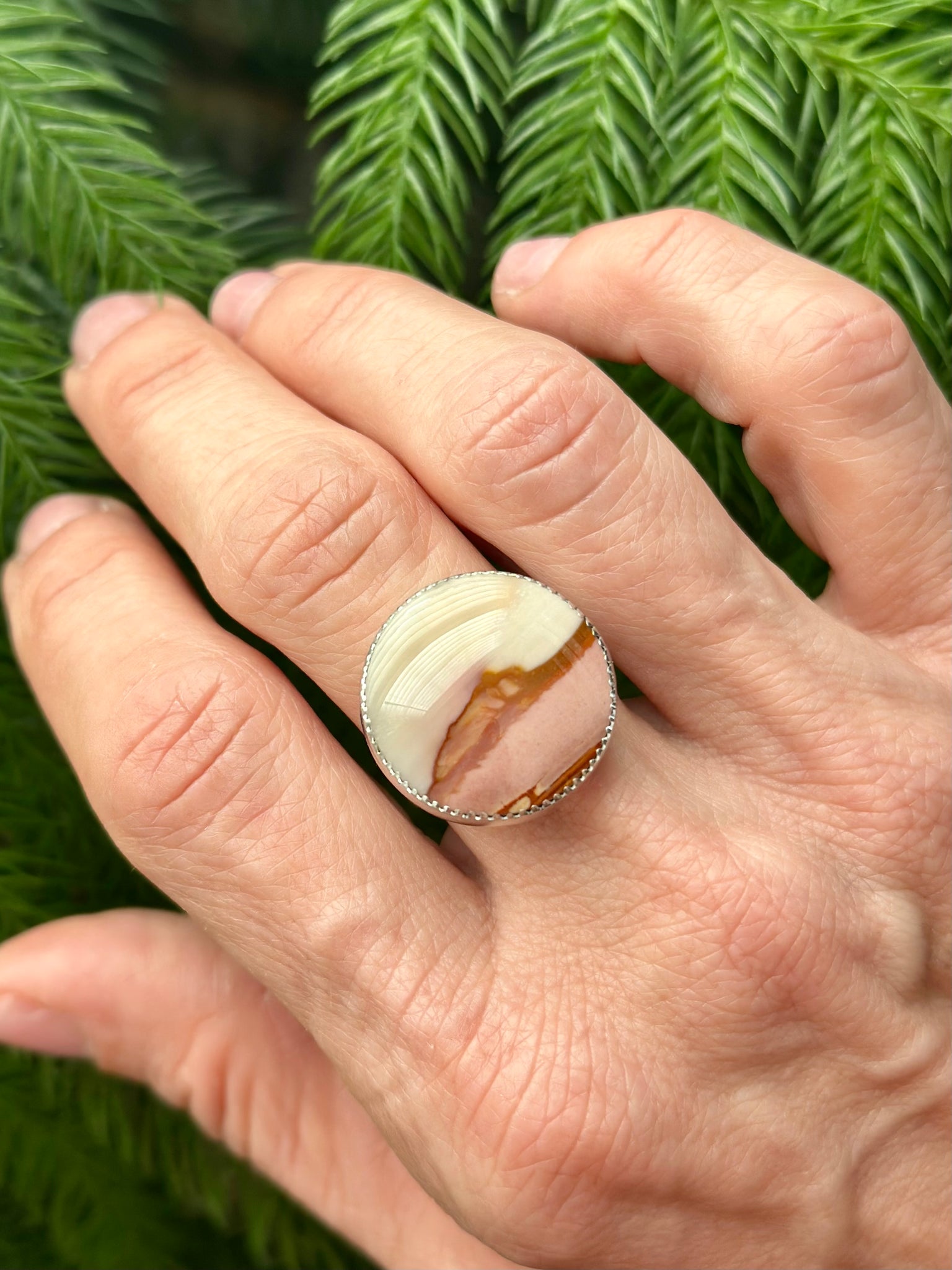 An absolute gorgeous, picturesque polychrome Jasper stone is set in a smooth sterling silver setting, polished for a high shine and complete with a slighting marbled texturized ring shank.