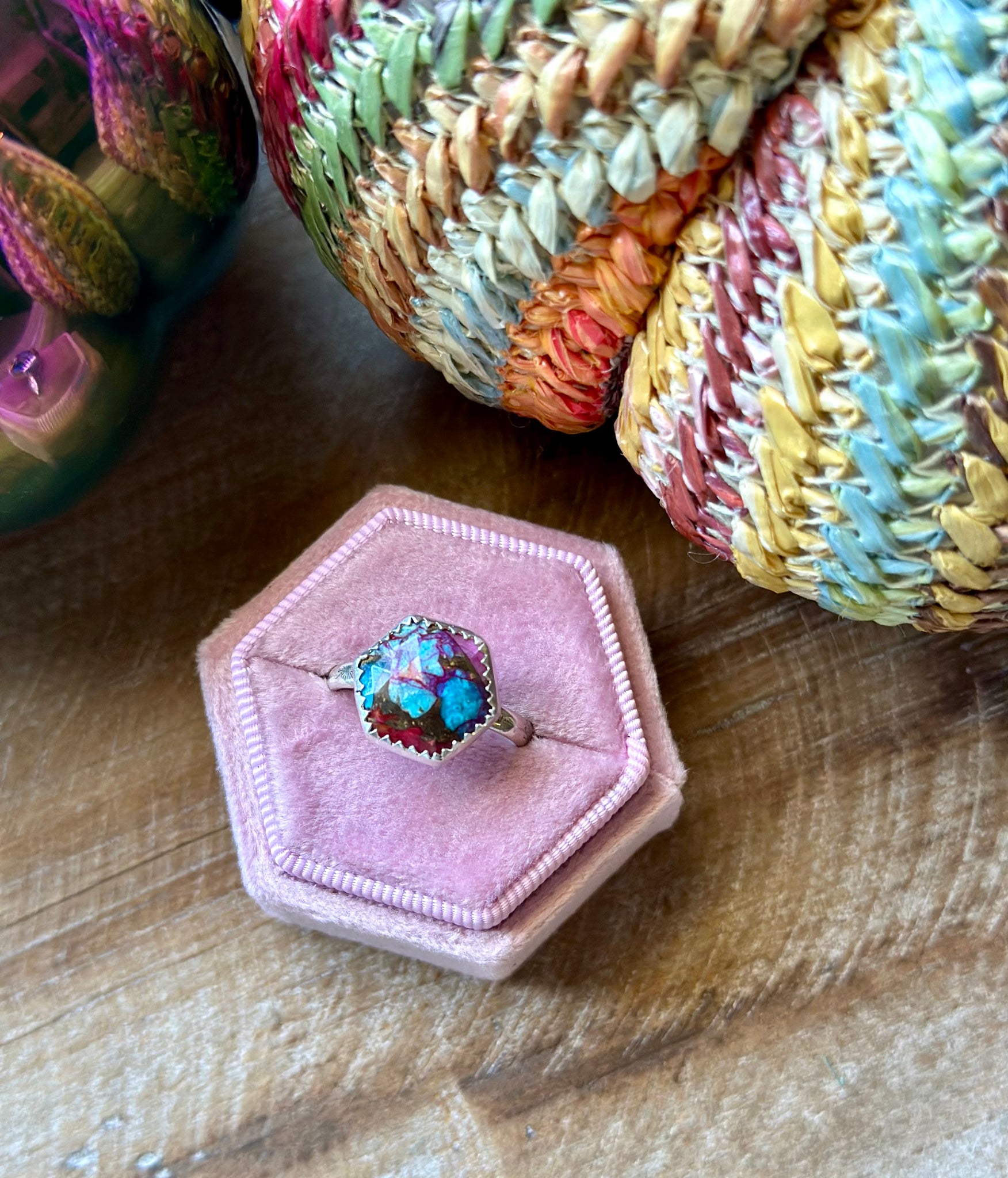 Abstract Mojave turquoise stone is surrounded by sterling silver, oxidized to highlight nooks and crannies and polished for a high shine.