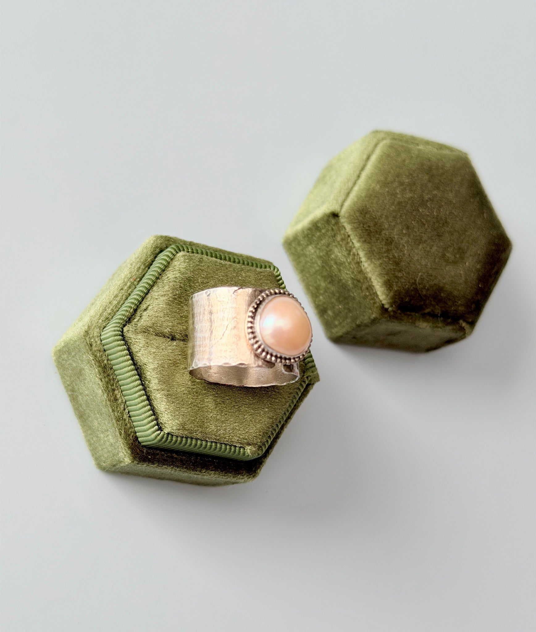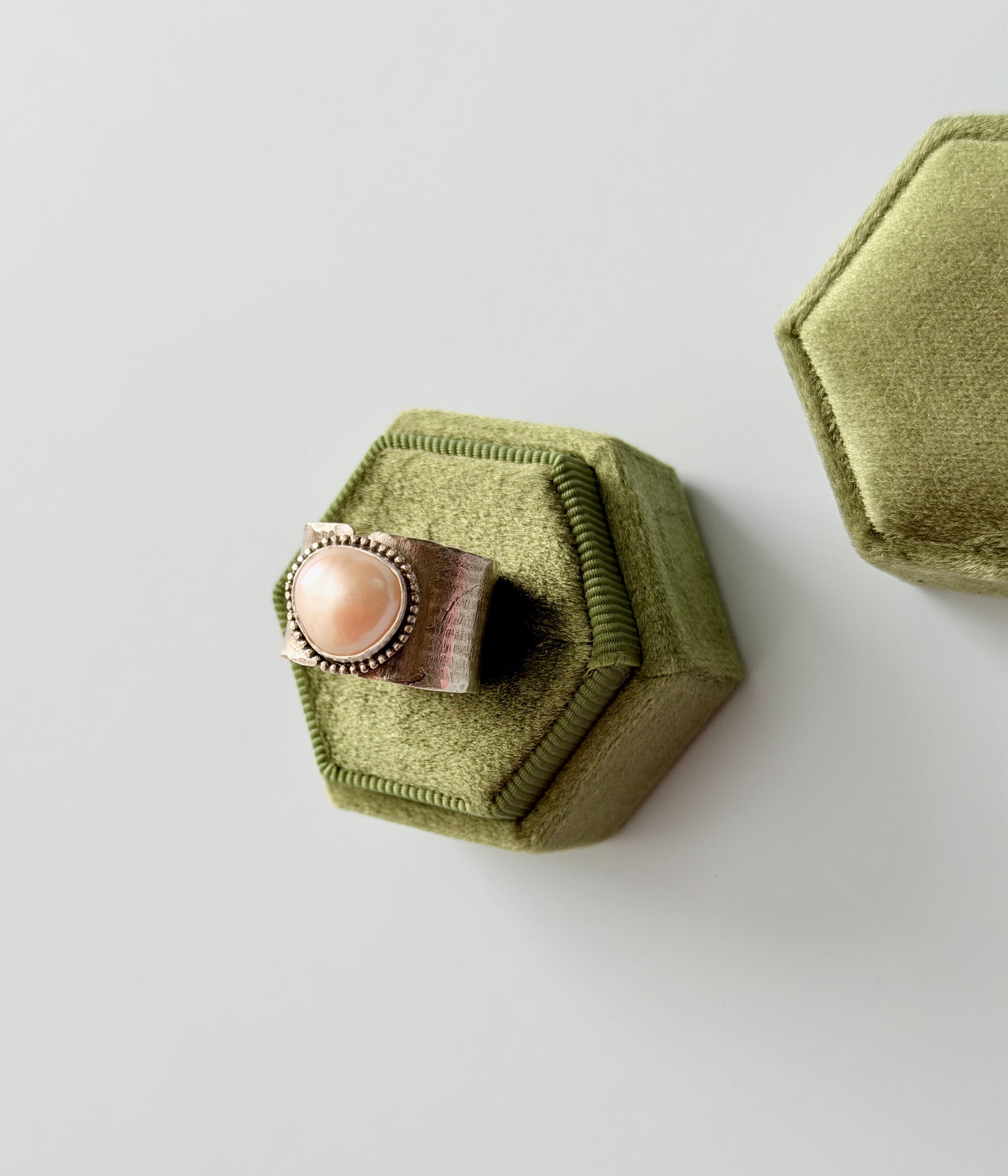 A lovely freshwater pearl is set in sterling silver with a beaded border. Setting sits on top of a recycled sterling silver thick textured ring band. Design to meant to have a little gap where the band meets the setting.