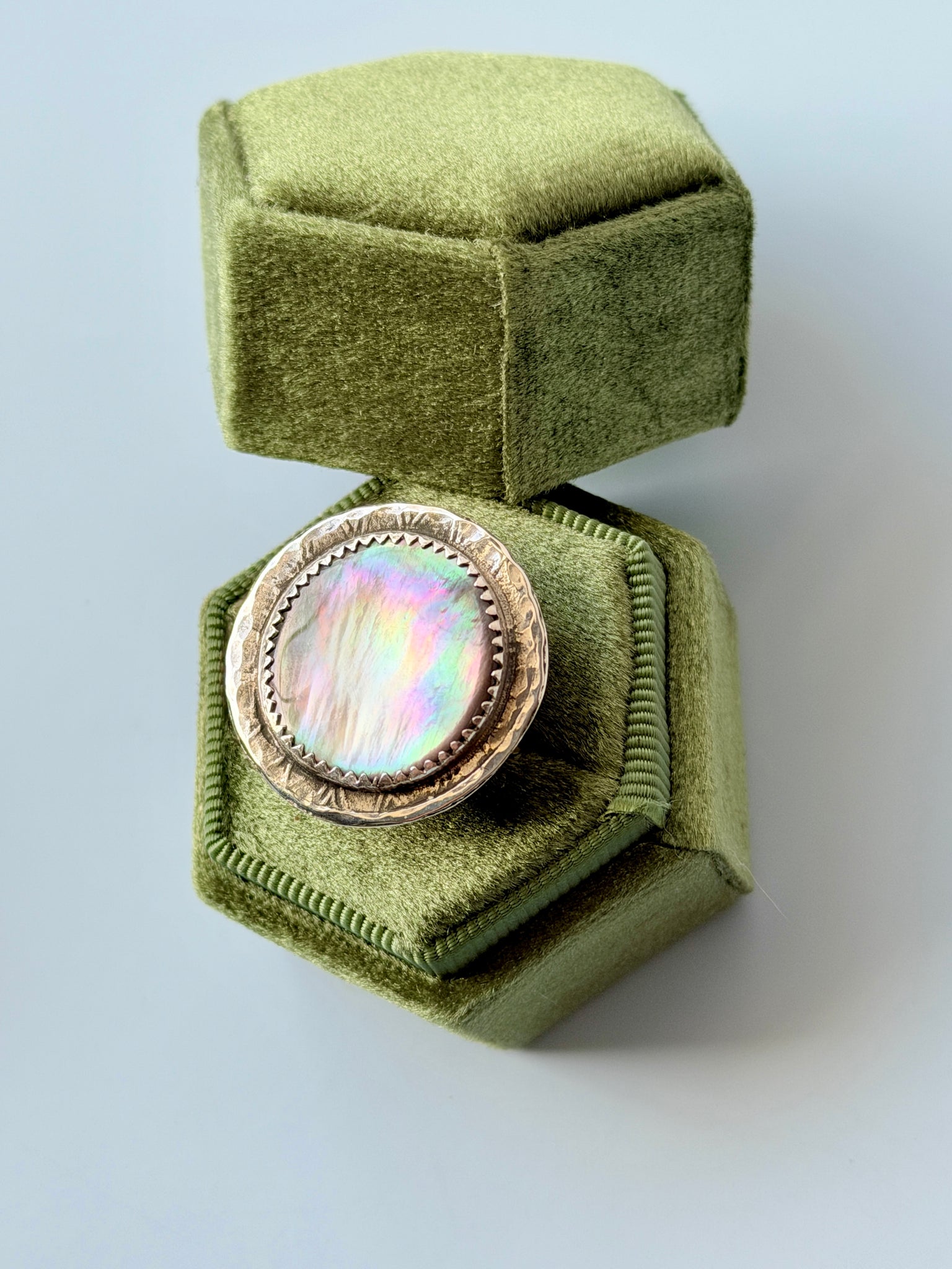 A gorgeous iridescent black mother of Pearl Stone has been set in a texturized sterling silver setting and back plate.