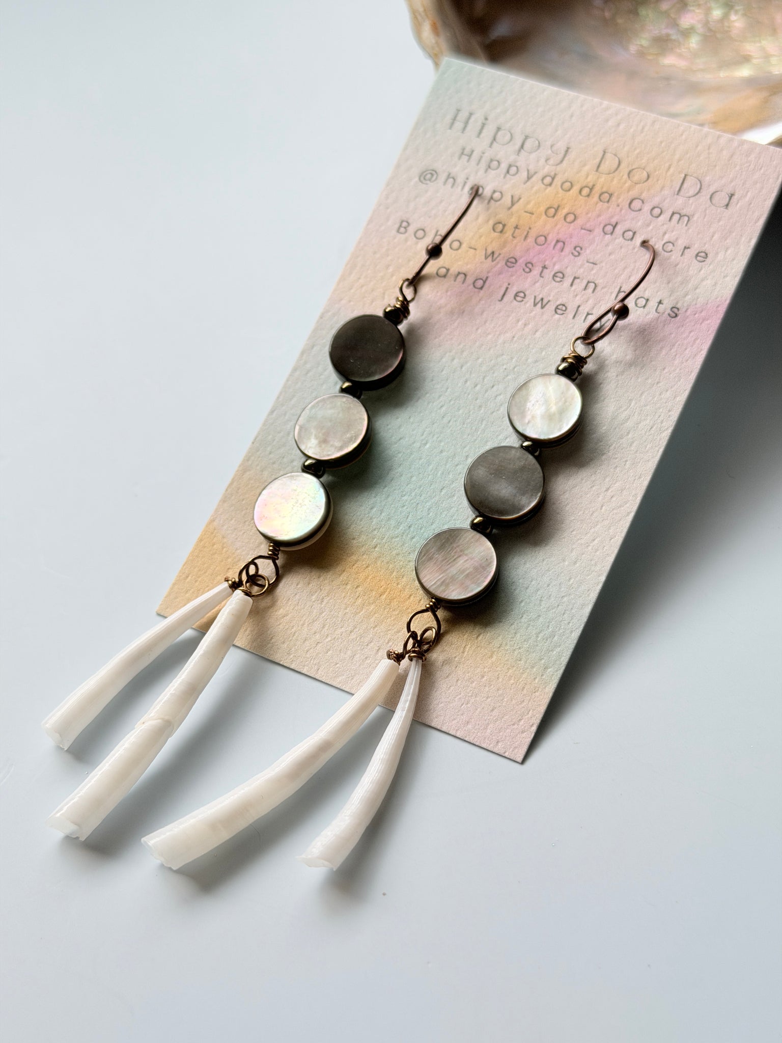Boho beauties offer an array of color and character! Rainbow mother of pearl beads paired with dentalium shell.