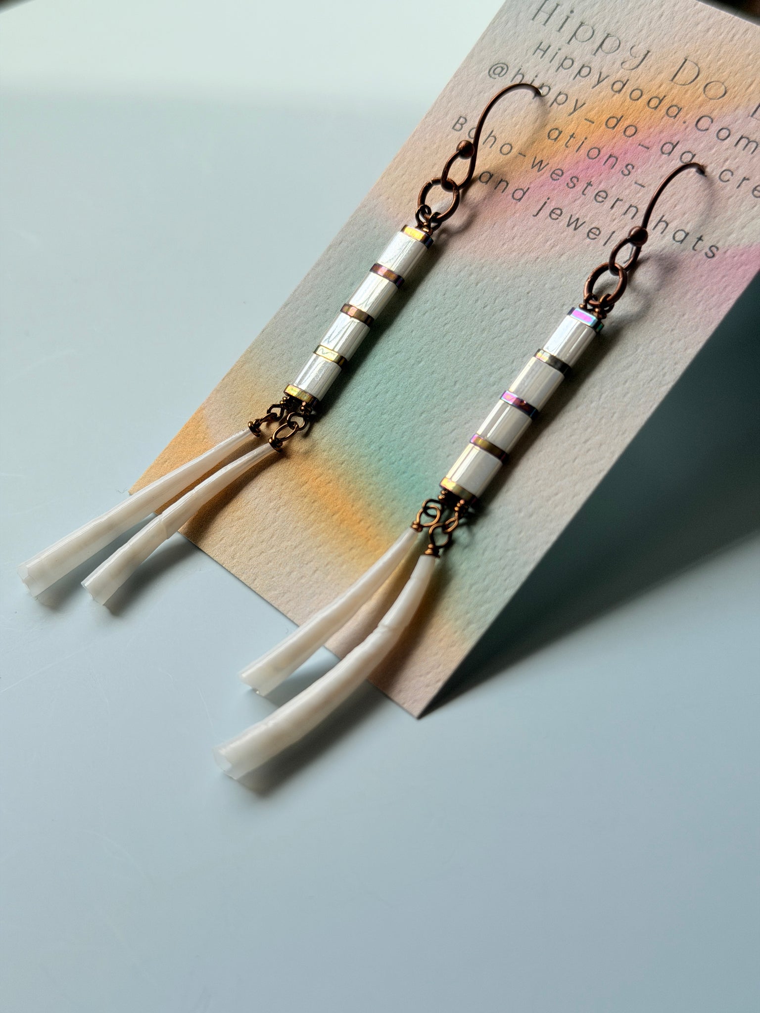 Boho beauties offer an array of iridescent color and character. Iridescent cream and purple Tila beads paired dentalium shell.