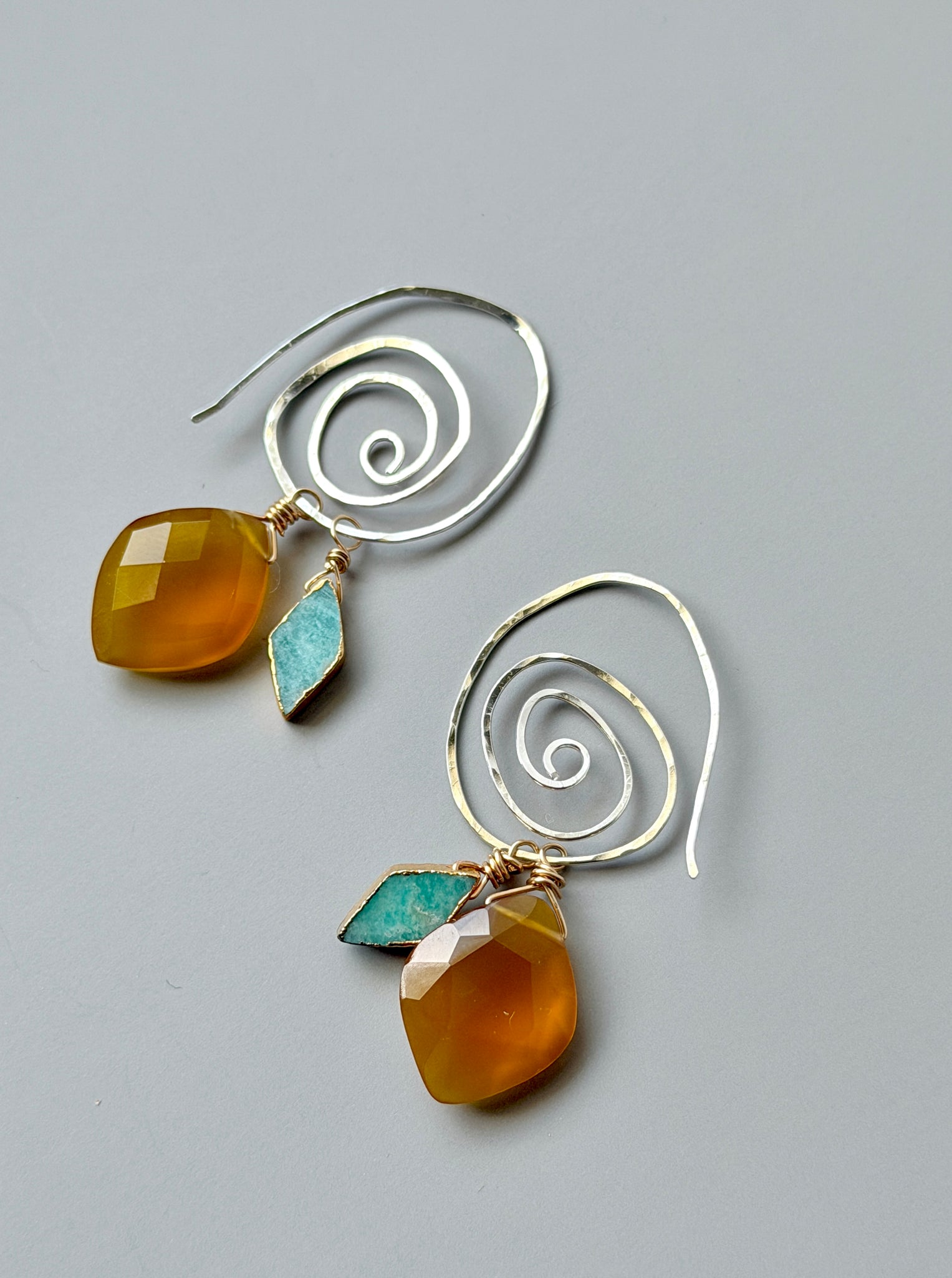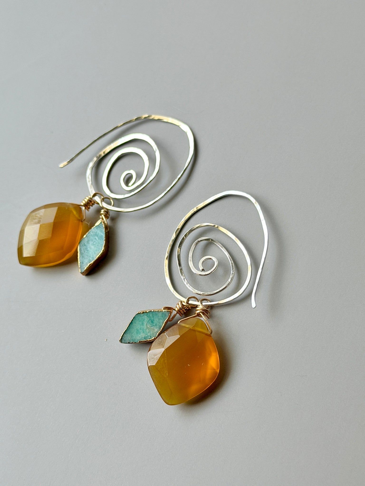 Hand forged and hammered swirly sterling silver wire adorned with amazonite and yellow chalcedony gemstone drops.