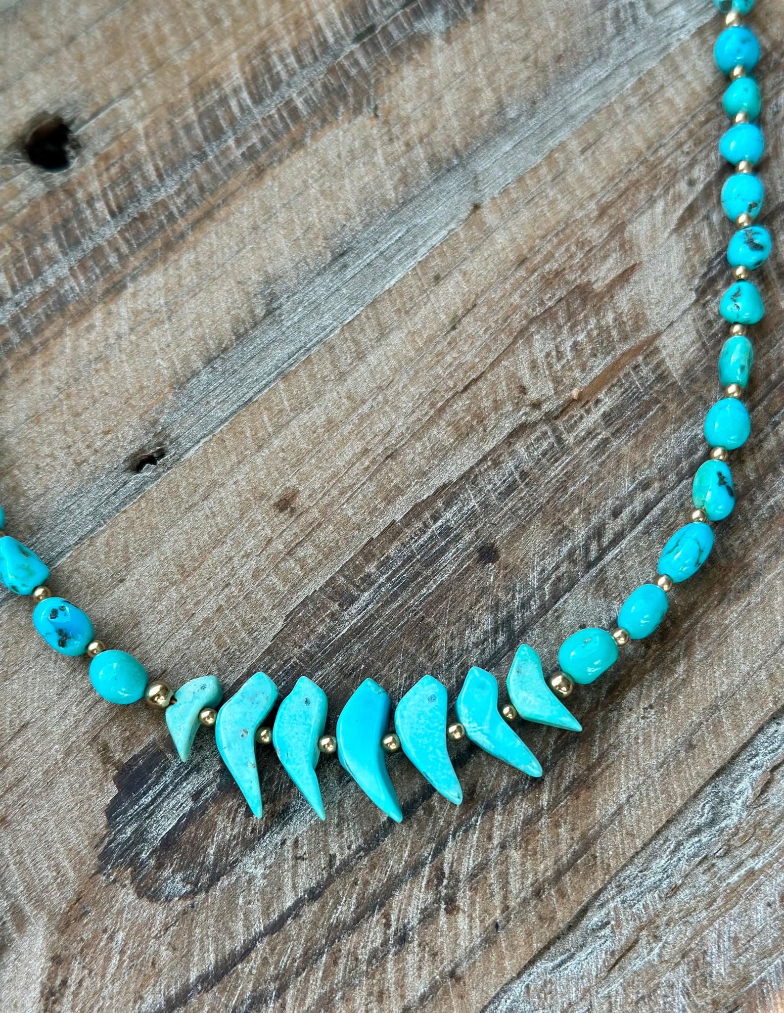 Beautiful, old stock, carved turquoise festish beads are surrounded by tiny 14k gold filled beads and kingman Turquoise nugget beads.