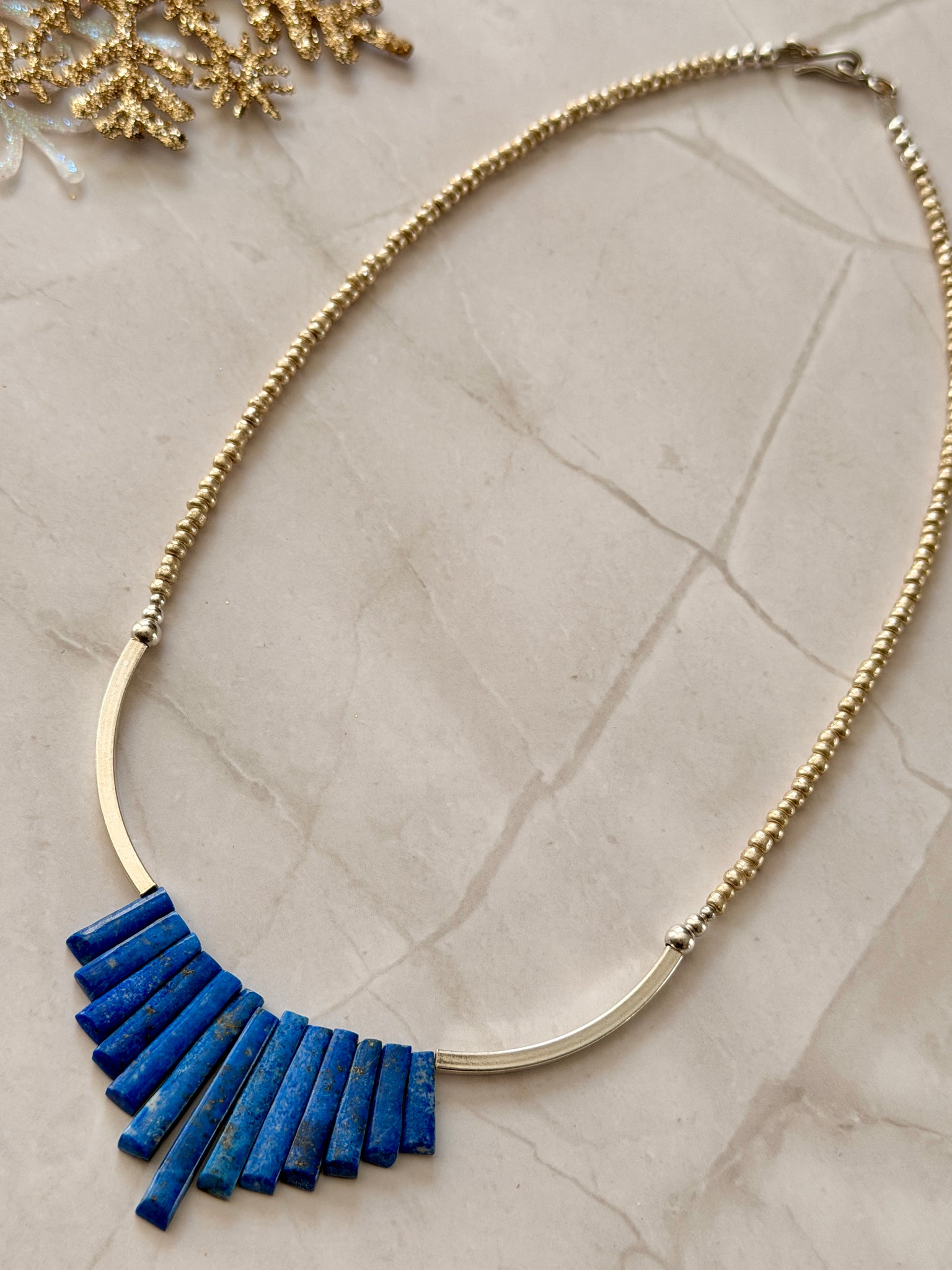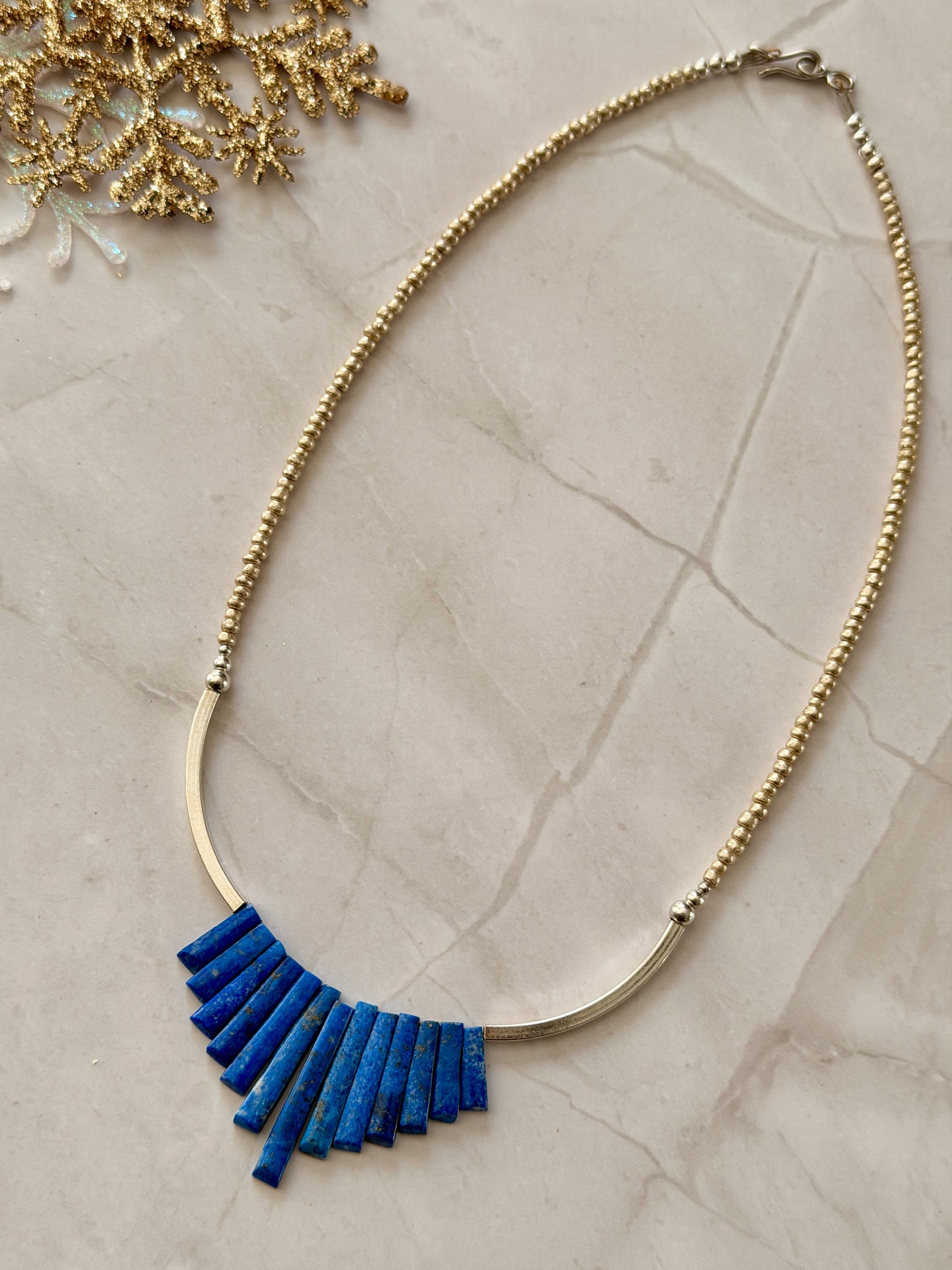 Beautiful, graduated lapis lazuli stick beads, paired with sterling silver tube beads and vintage metallic seed beads. Necklace hangs 17.5 inches long and fastens with sterling silver findings.
